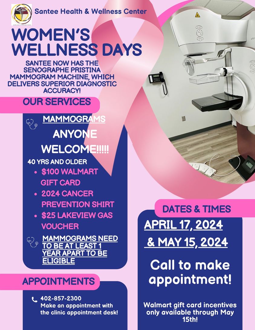 Breast cancer screenings will be available through the Santee Health Center’s Mammography unit on April 17, 2024 and May 15th, 2024!